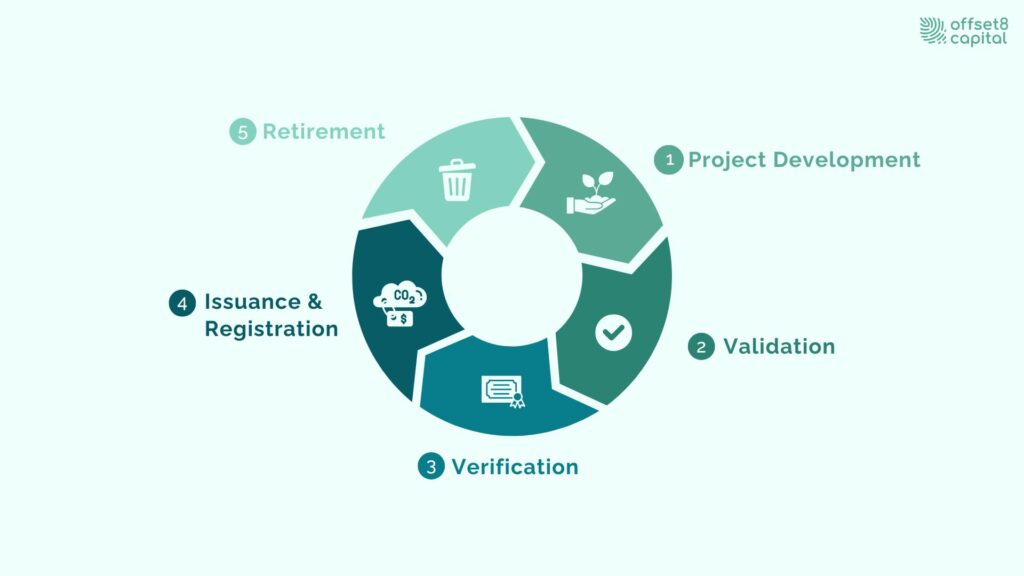 Carbon credits are generated through a structured lifecycle that includes methodology selection, project design, project implementation, project validation and verification, certification, issuance, and eventual retirement after use.