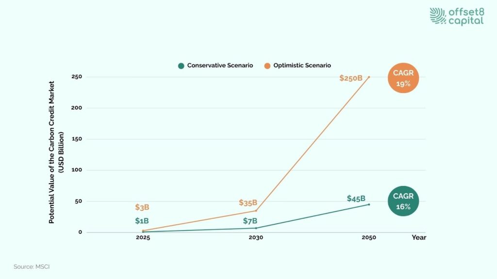 The carbon credit market size is expanding rapidly. According to MSCI, the carbon credit market could expand to USD 7 to 35 billion by 2030, supported by stronger corporate climate targets and new policy frameworks. Demand for removal credits, including those from nature-based projects and Direct Air Capture (DAC), is expected to rise sharply.