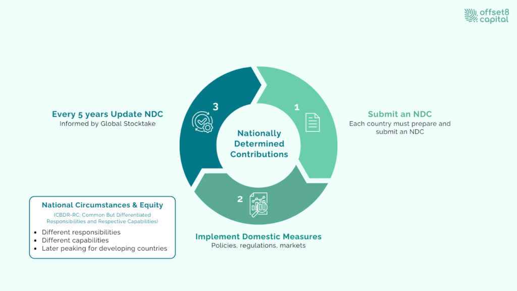 NDCs serve as the fundamental accounting reference for national emission targets and underpin the transfer of mitigation outcomes and Corresponding Adjustments under Article 6 of the Paris Agreement. As such, NDCs constitute the institutional and accounting foundation of carbon credit markets.